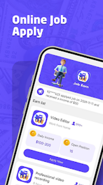 Job Earn: Online Job Apply เป็นแอป Android ที่เชื่อมต่อผู้ใช้กับโอกาสงานที่ยืดหยุ่นและงานพาร์ทไทม์ที่หลากหลายซึ่งปรับให้เข้ากับตารางเวลาและเป้าหมายของแต่ละบุคคล แอปนี้มีรายการงานที่ได้รับการตรวจสอบที่หลากหลายตั้งแต่งานระยะไกลไปจนถึงตำแหน่งพาร์ทไทม์ในหลายสาขา ทำให้มั่นใจได้ว่าผู้ใช้สามารถค้นหาโอกาสที่ตรงกับทักษะและความสนใจของพวกเขาได้